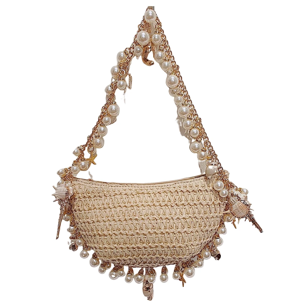 Женская элегантная соломенная сумка на плечо с жемчужной цепочкой, праздничная пляжная сумка, дышащая модная сумка на плечо с бисером, морской мягкий клатч