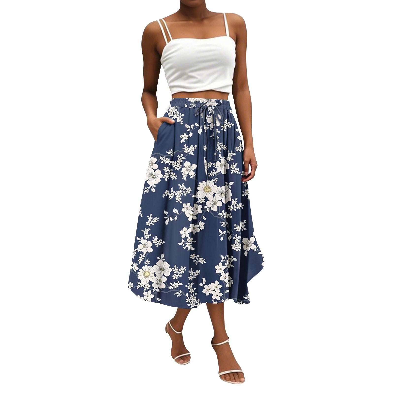Женская юбка в стиле бохо с цветочным принтом, однотонная повседневная юбка с карманами M тёмно-синий