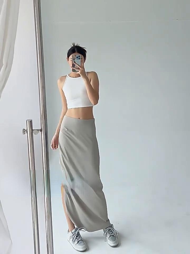 Женская юбка-миди с разрезом, летняя тонкая трапециевидная юбка с высокой талией, женская винтажная уличная одежда Y2K, повседневная сумка на бедрах цвета хаки