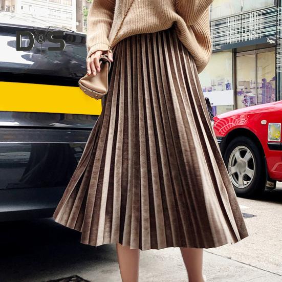 Женская юбка миди с эластичной высокой талией, однотонная, свободная, длинная юбка, плиссированная, бархатная, осенне-зимняя юбка
