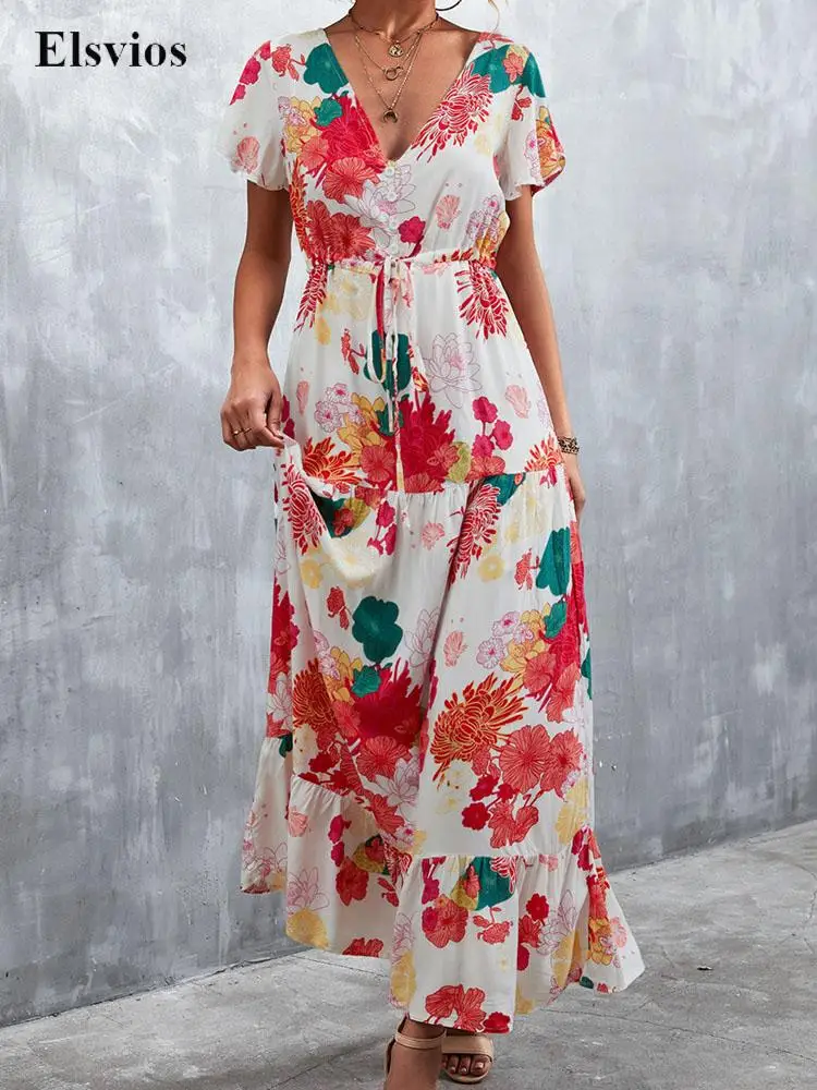 Женские Элегантные пляжные платья в стиле бохо с цветочным принтом, женское сексуальное Вечерние нее платье на пуговицах с V-образным вырез...
