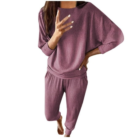 Women s 2 Piece Sweatsuit Solid Color Long Sleeve Pullover Tops with Long Pants Sets Tracksuit Pajamas PJs Suits