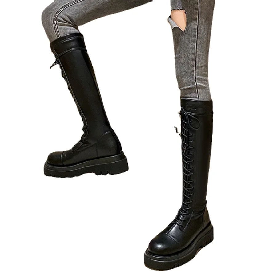 Женские армейские сапоги до колена, длинные черные сапоги из натуральной кожи, на молнии, на платформе, со шнуровкой, в стиле милитари, с плюш...