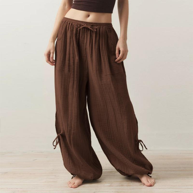 Женские брюки весна-лето, простой стиль, завязка на узле, повседневные брюки из мятой ткани, драпированные женские тонкие брюки