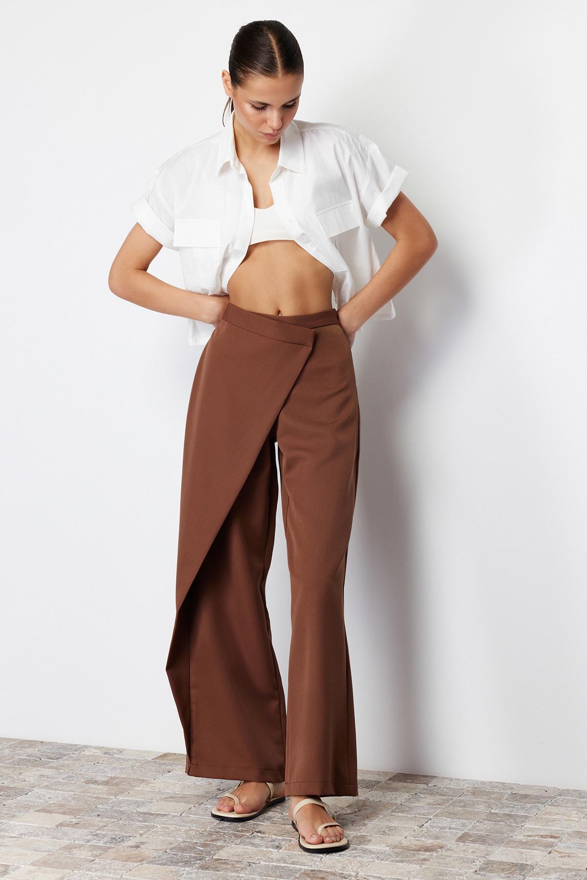 Женские брюки, модные новые сезонные коричневые широкие брюки с перекрестной застежкой и детальными ткаными брюками