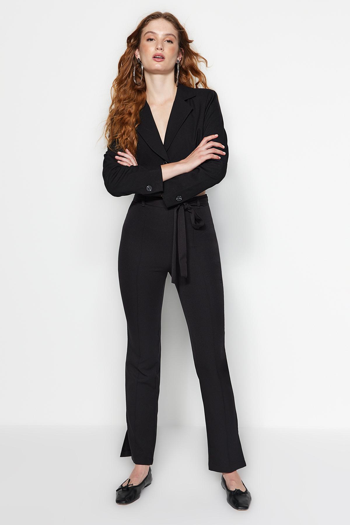 Женские брюки, модные новые сезонные черные узкие тканые брюки в рубчик с поясом