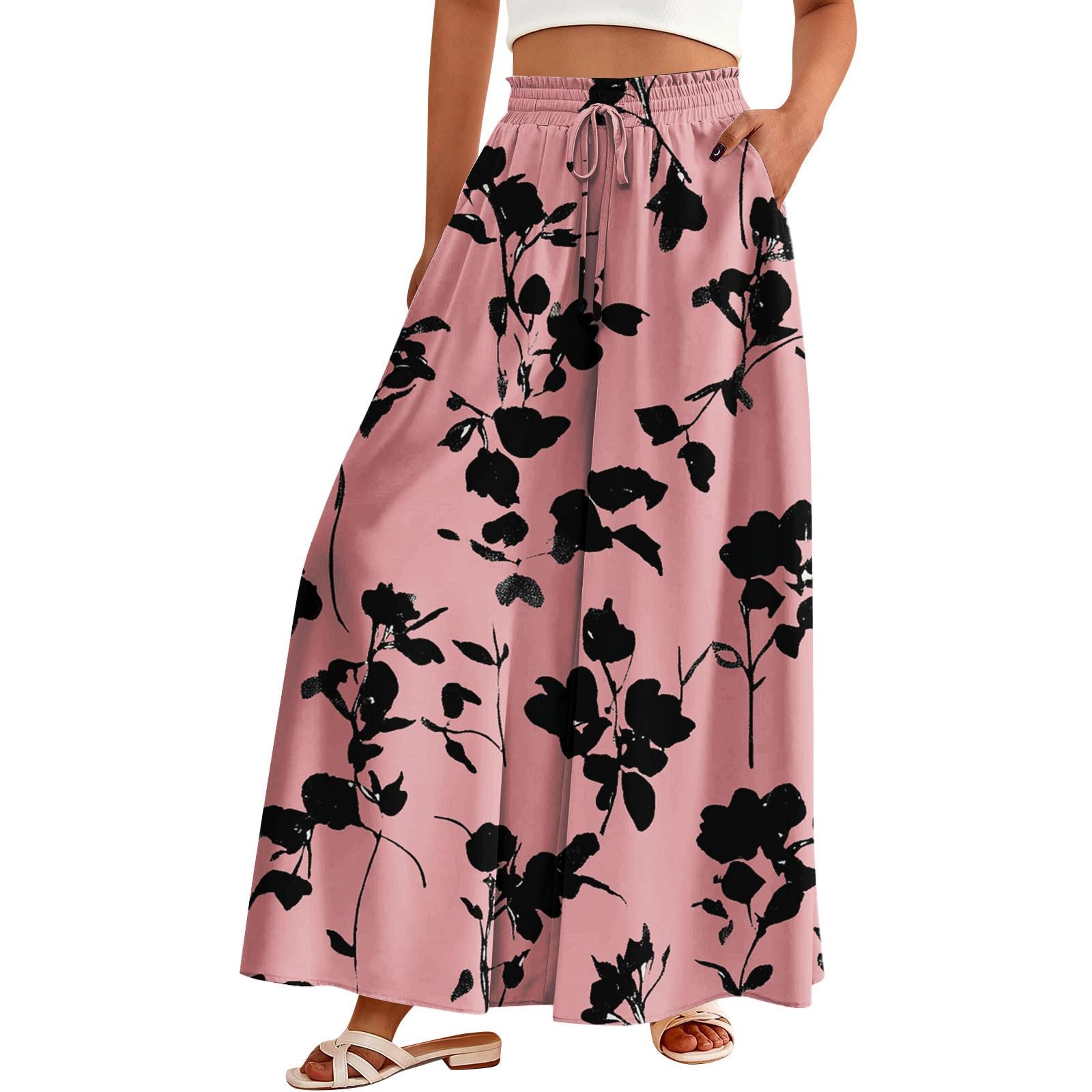 Женские брюки-палаццо с цветочным принтом в стиле бохо, широкие брюки, летние пляжные струящиеся брюки с высокой талией и карманами L розовый