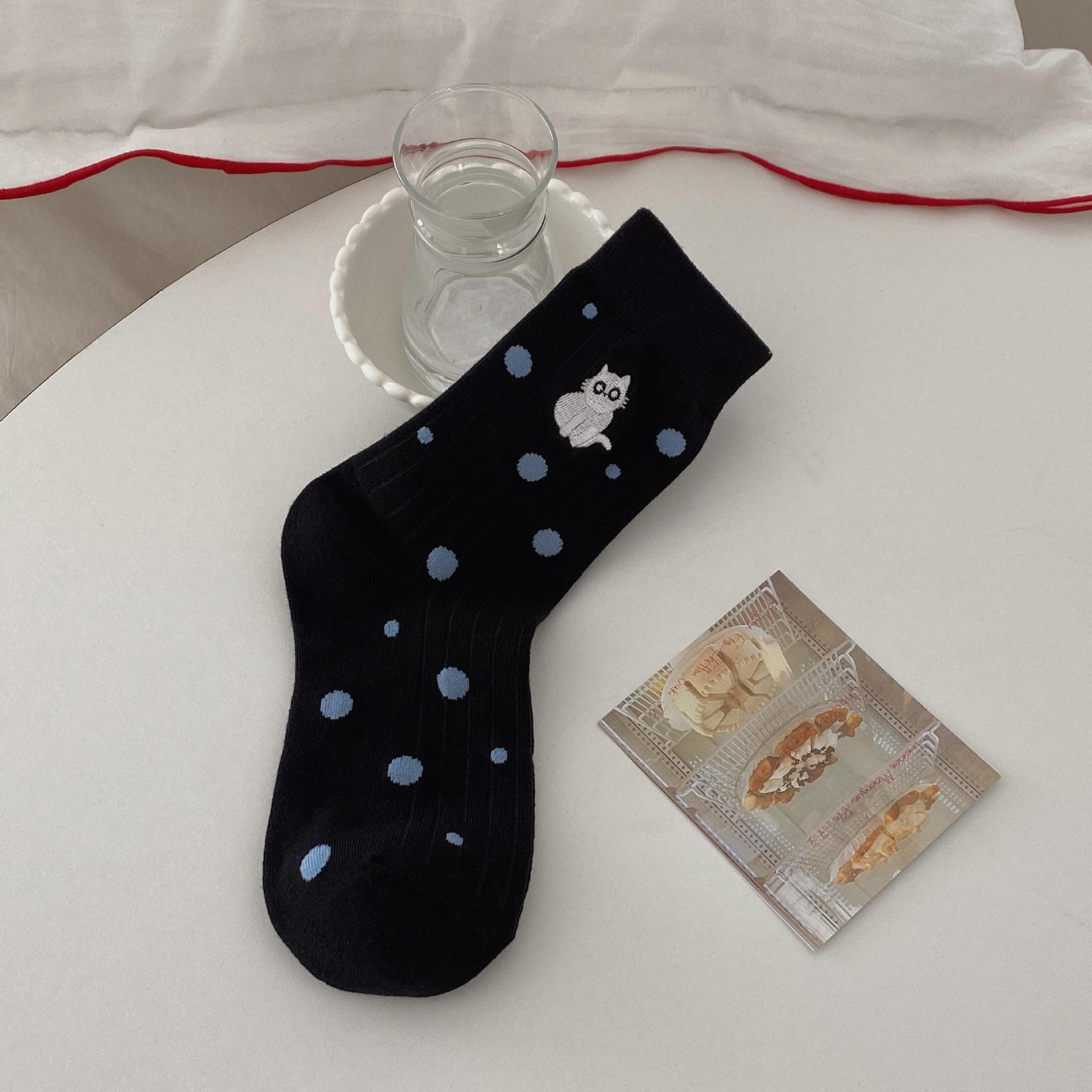 Женские весенне-летние новые трендовые мультяшные черно-белые кошачьи носки-гольфы в горошек из чистого хлопка 1 pair чёрный