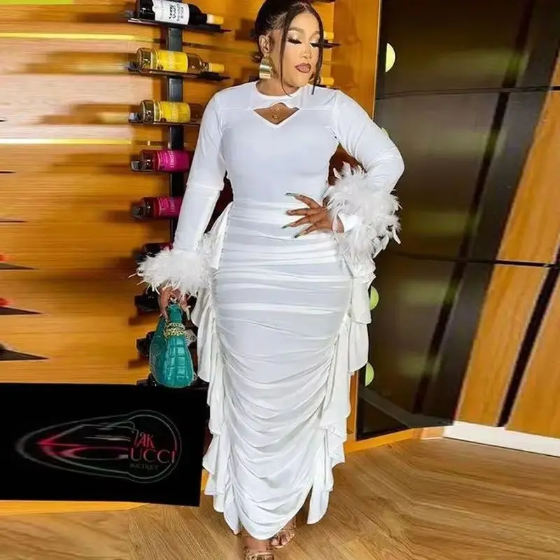 Женские вечерние платья в африканском стиле с перьями и длинными рукавами, рюшами и оборками, черные вечерние платья для девочек, великолепные белые платья-футляры для выпускного вечера