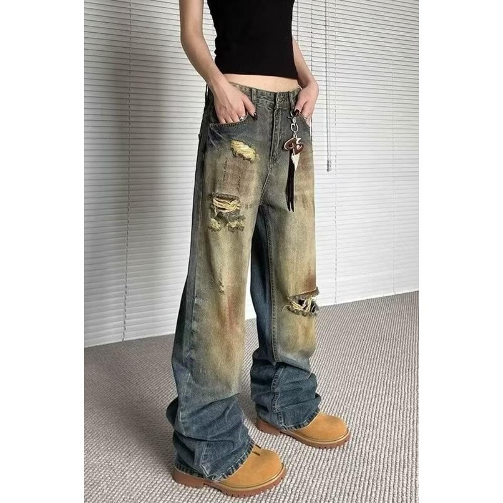 Женские грязные старые джинсы с дырками, винтажные уличные крутые женские брюки с высокой талией, широкие брюки, женские повседневные прямые джинсовые брюки S