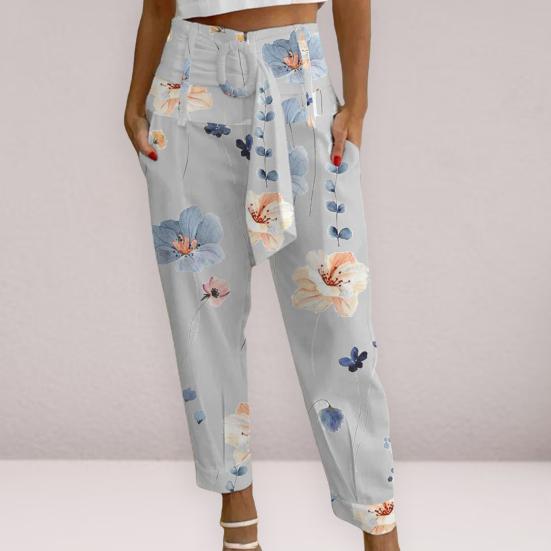 Женские девятые брюки OL Стиль с цветочным принтом, высокая талия, прямой пояс, декор, карманы, длина до щиколотки, женские брюки, женская одежда