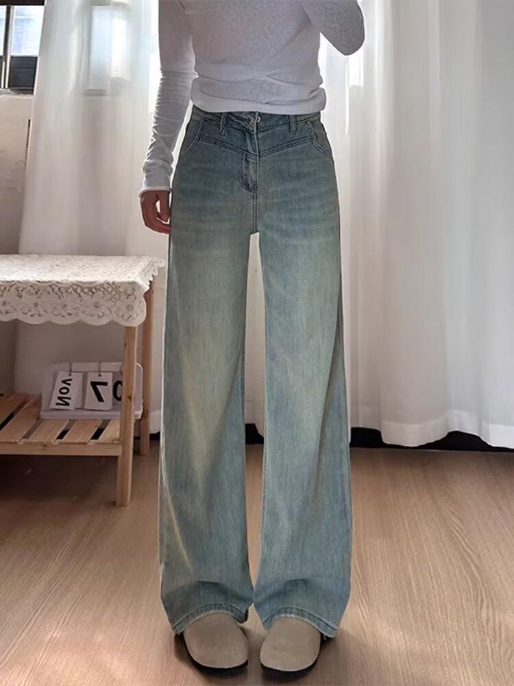 Женские джинсы больших размеров с широкими штанинами на бархатной подкладке - Осень/Зима Свободный крой, Стройнящие, Драпированные брюки прямого кроя 2XL светло-синий