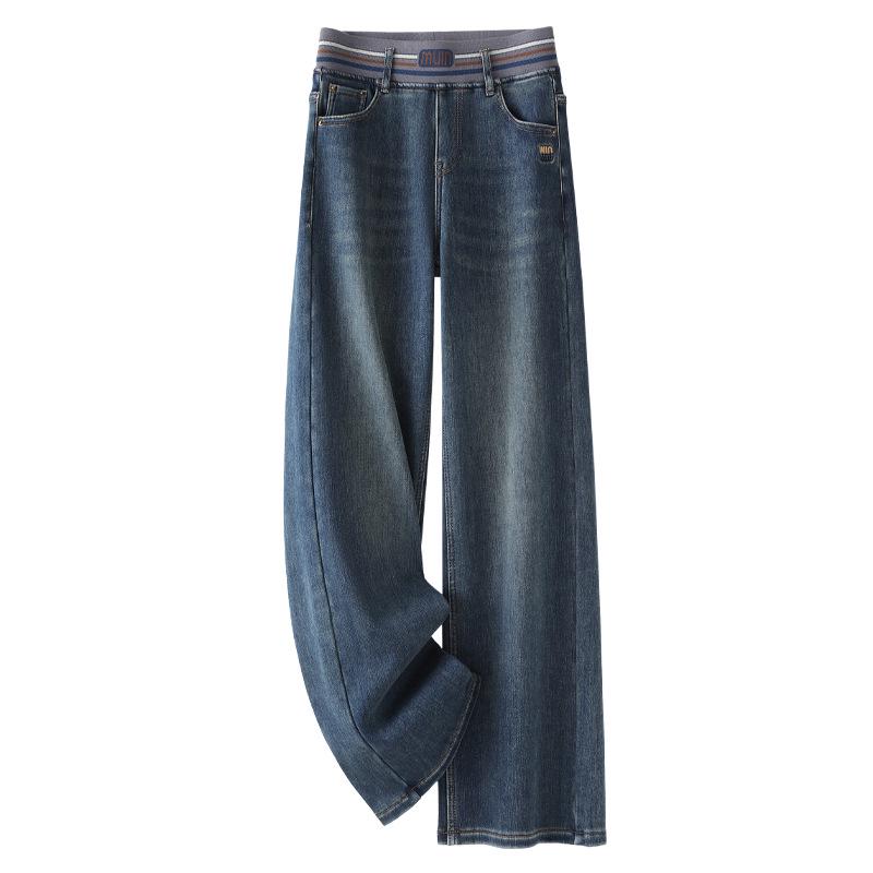 Женские джинсы с высокой посадкой, на флисовой подкладке, ретро-синие, прямого кроя, осень/зима 2024, длиной до пола. 4XL