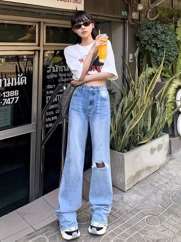 Женские джинсы с высокой талией, в стиле ретро, рваные, с широкими штанинами, весна/лето 2024 - облегающие брюки прямого кроя длиной до пола S синий