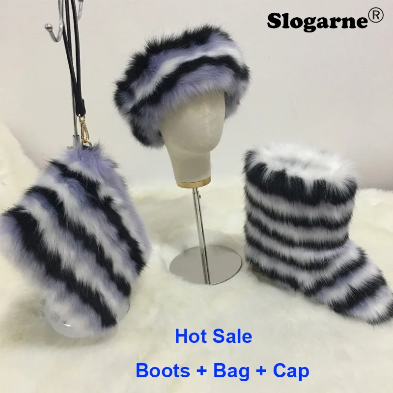 Женские зимние ботинки из лисьего меха 2022, шапка-мешок, женские зимние модные комплекты, пушистые меховые ботинки, плюшевые ботинки, зимняя ...