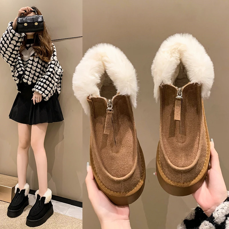 Женские зимние ботинки на меху, новинка 2022, плюшевая толстая и теплая Нескользящая короткая хлопковая обувь на молнии спереди, кожаные боти...