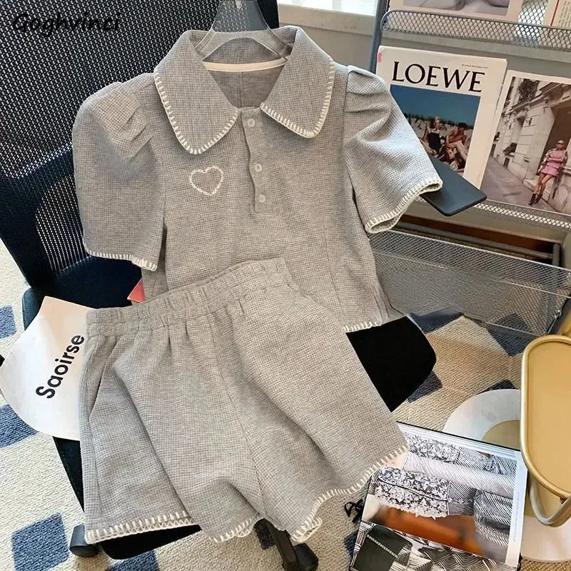 Женские комплекты с рукавами-фонариками в форме сердца, укороченные топы в стиле преппи, свободные шорты в Корейском стиле, новинка на лето, милая Модная молодежная Повседневная шикарная одежда
