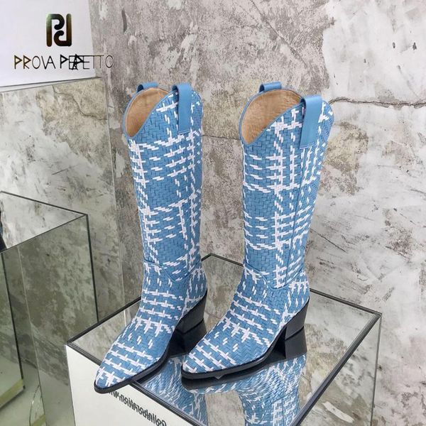 boots woven genuine leather women 2021 autumn winter sleeve thick heel pointed toe slip-on knee-high knight fashion1, Black