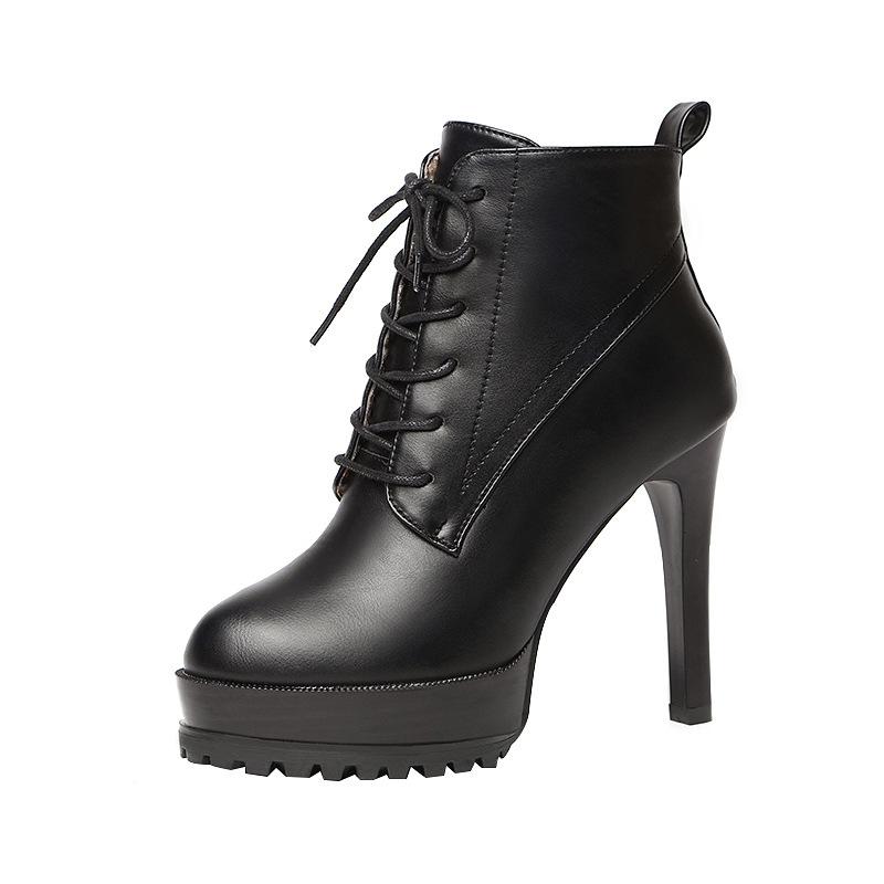 Женские короткие ботинки Толстый каблук Мода Круглый носок Шнуровка Ботинки Мартина Осень и Зима Одинарные ботинки Короткое голенище Высокий каблук Толстая подошва 39 чёрный