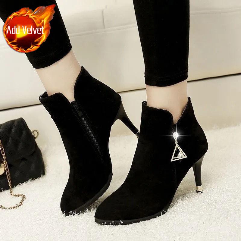 Женские короткие ботинки на каблуке с острым носком, осенне-зимние, черные, ботильоны, высокое качество, новые, шикарные и элегантные ботильоны 36