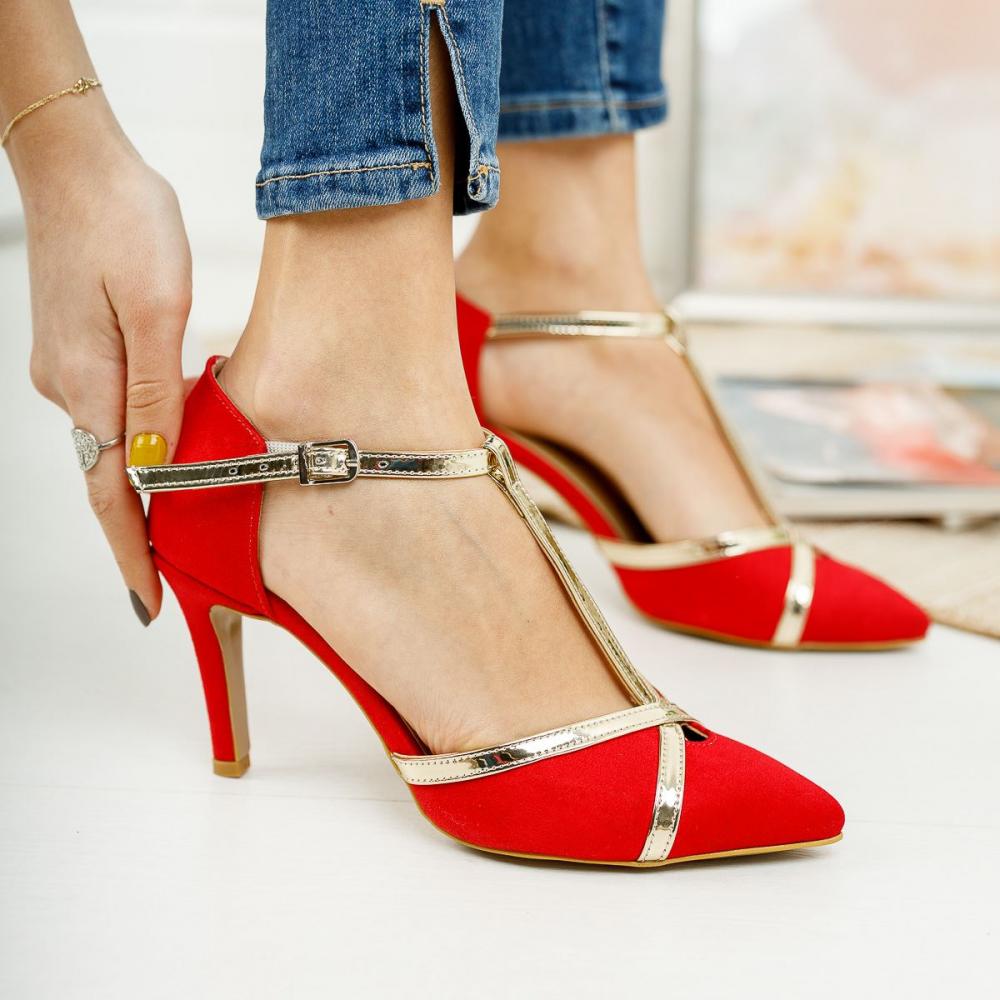 Женские красные замшевые туфли на каблуке с острым носком и золотым шлемом