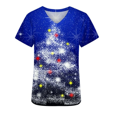 qucoqpe Women s Christmas Costume V-Neck Short Sleeve Nursing Uniform Xmas Tree Santa Snowman Deer Printed Workwear Holiday Graphic Tees Blouse Scrub Tops with Pockets Christmas Gifts on Clearance