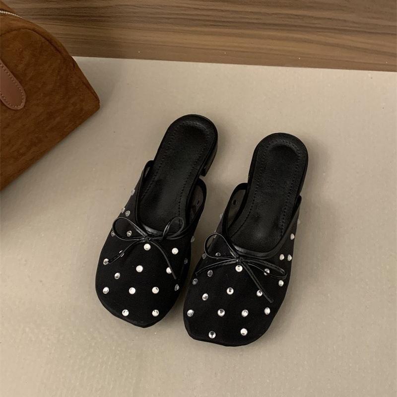 Женские летние мюли с кружевом и стразами, дышащие сетчатые женские тапочки с закрытым носком, балетки для платья, шлепанцы для женщин 39 чёрный