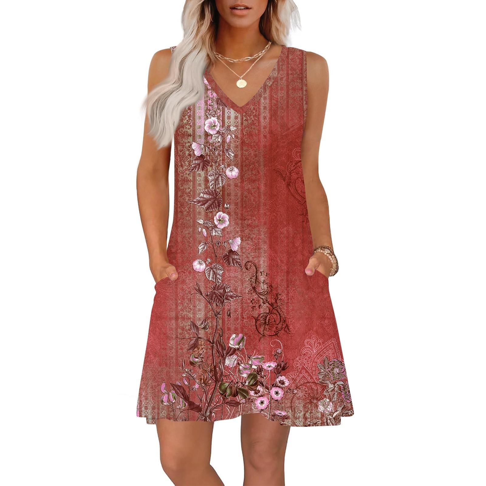 Женские летние платья свободного кроя с принтом V-образным вырезом без рукавов сарафаны пляжное гавайское платье с карманами XL красный