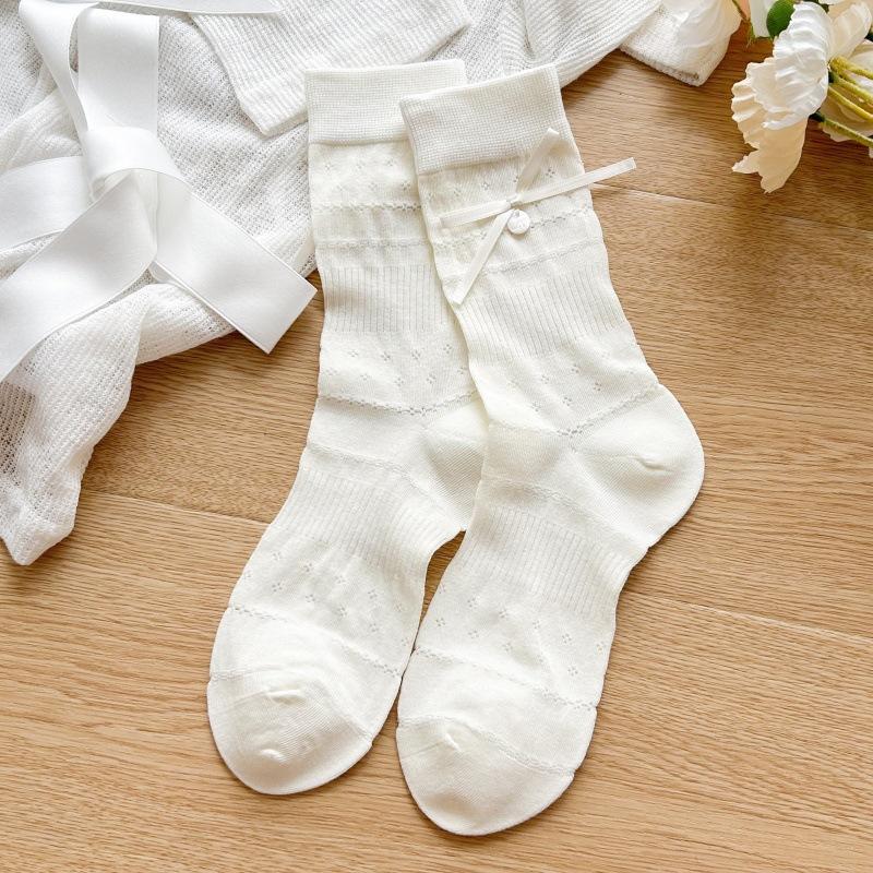 Женские летние тонкие носки-гольфы с ленточным бантом, пуговицей, сетчатые, полые, дышащие, бесшовные 1 pair молочный белый