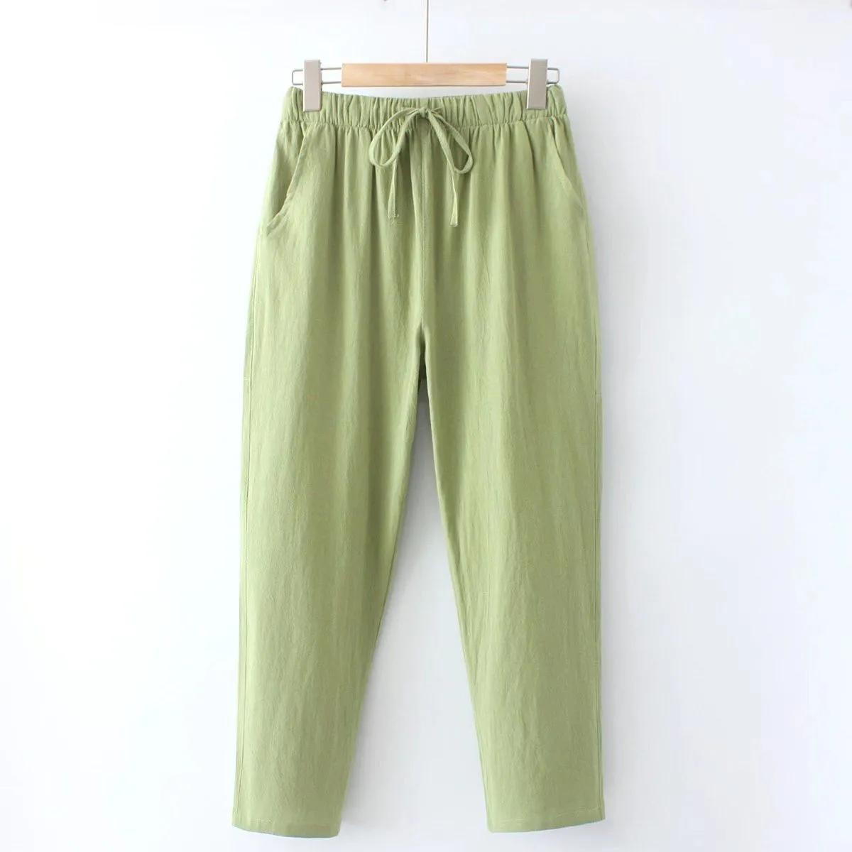 Женские летние хлопковые свободные прямые брюки однотонные простые удобные брюки с эластичной резинкой на талии M зелёный