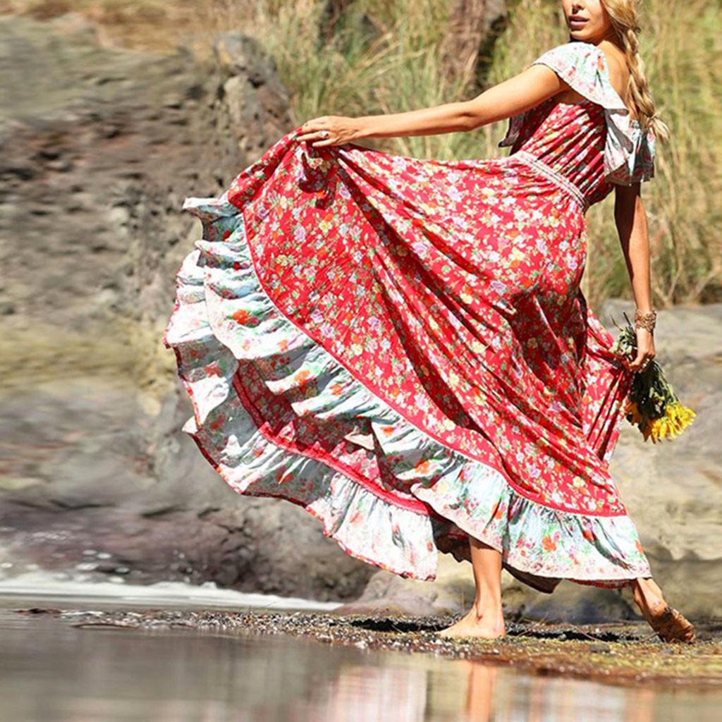 Женские летние шифоновые пляжные длинные платья в богемном стиле с V-образным вырезом на талии XL красный