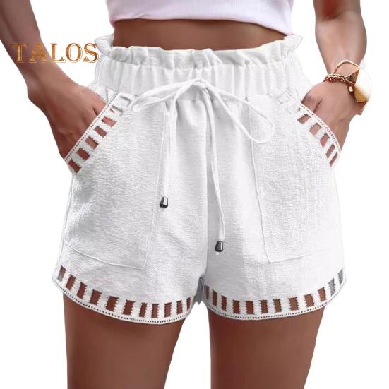 Женские летние шорты с завязками, эластичной резинкой на талии, с гофрированными краями, полые боковые карманы, сплошной цвет, свободные выше колена, повседневные спортивные повседневные мини-шорты L белый