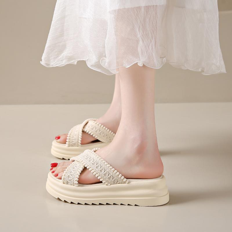 Женские милые тапочки, летние уличные нарядные с открытым носком, повседневные сандалии на толстой подошве для девочек, сандалии на платформе, большие размеры 34 бежевый