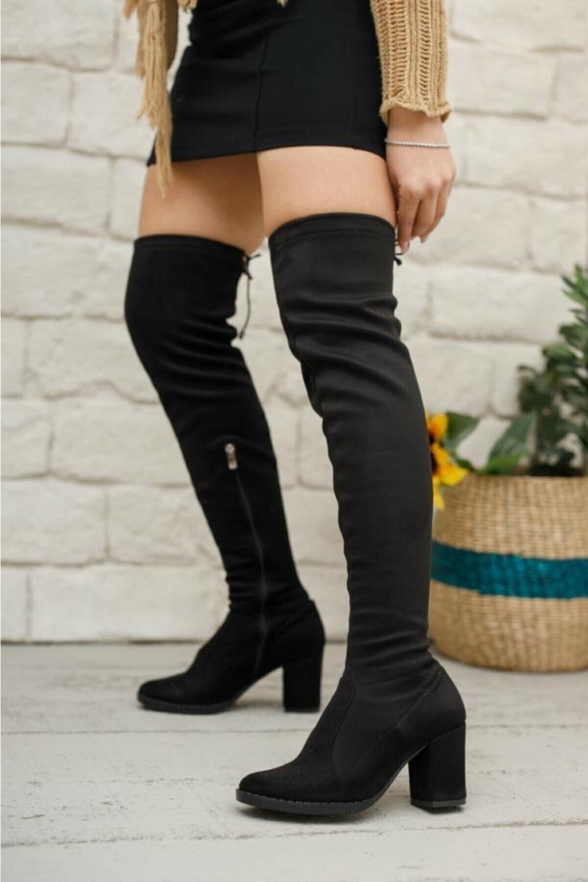 Женские модные повседневные черные эластичные носки, замшевые сапоги выше колена на толстом каблуке, ботфорты на молнии на шнуровке