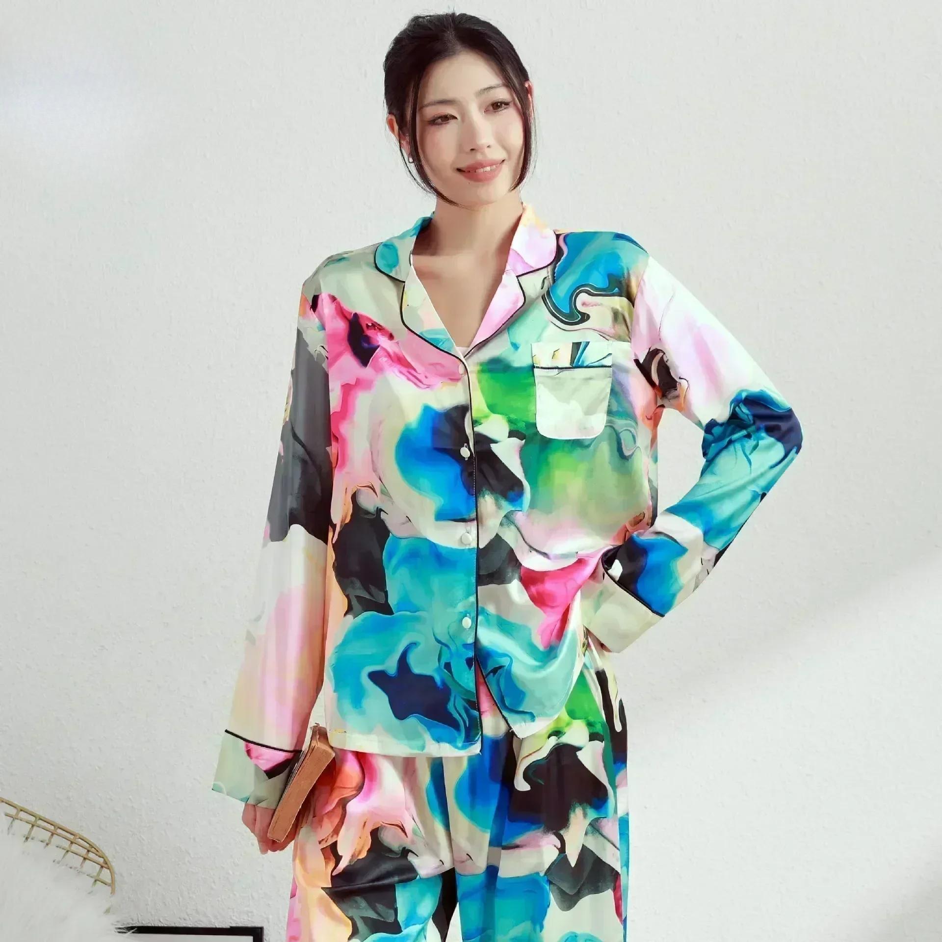 Женские осенние длинные брюки с длинными рукавами и цветной пижамой из ледяного шелка с принтом, которые можно носить как верхнюю одежду, домашний костюм XXXL