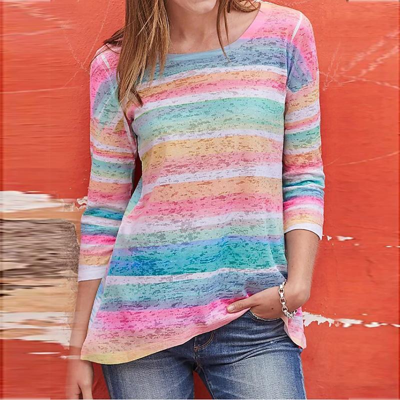 Женские осенние топы, свободные кошки, красочные полоски с принтом, повседневная футболка с длинными рукавами, топ, блузка