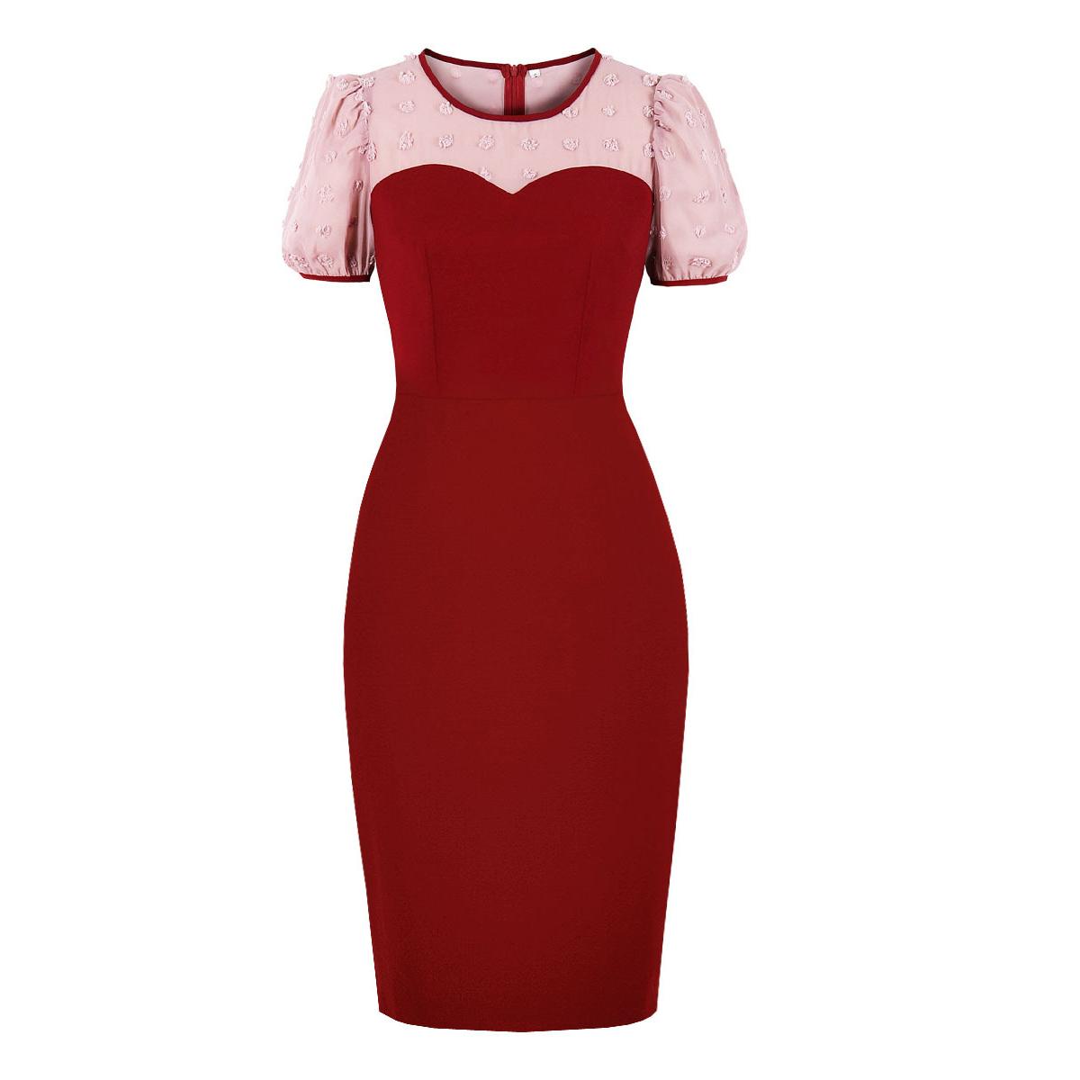 Женские офисные платья Сетчатое платье с цветочным принтом и короткими рукавами контрастного цвета. Облегающее платье-карандаш с запахом розового и красного цвета. Праздничная вечеринка, рабочая повседневная одежда.