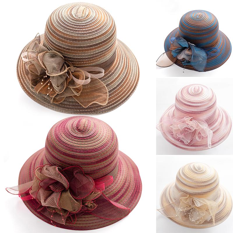 Женские пляжные шляпы от солнца с широкими полями, красочная полоса, цветочный декор, защита от солнца, шляпа из органзы, летняя