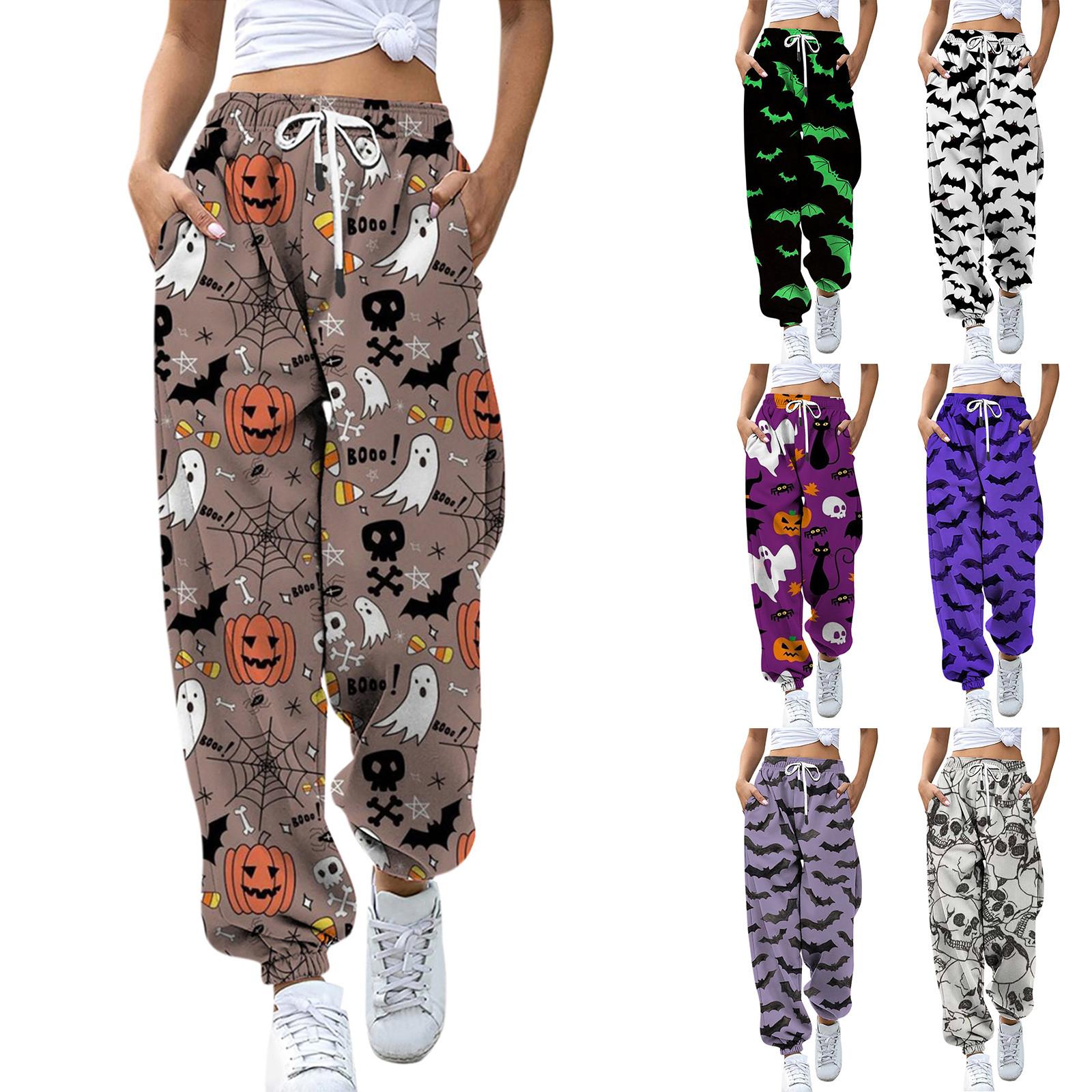Женские повседневные брюки с принтом Хэллоуина, брюки с эластичной резинкой на талии и карманами