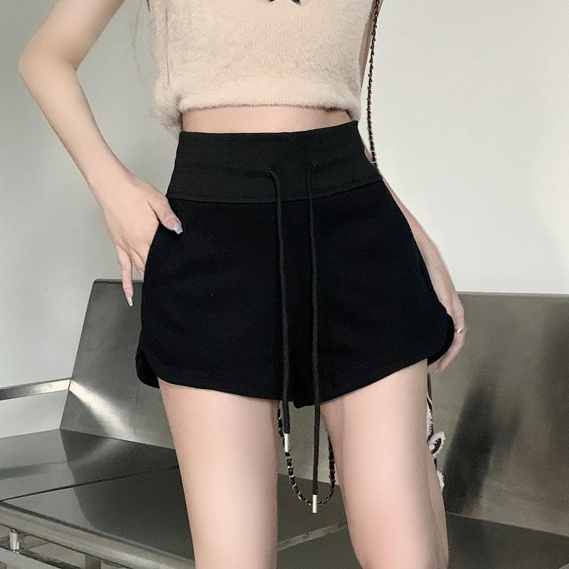 Женские повседневные спортивные шорты А-силуэта с высокой посадкой - Однотонные, Слим-фит, Широкие штанины, Со шнурком Medium (Premium) чёрный