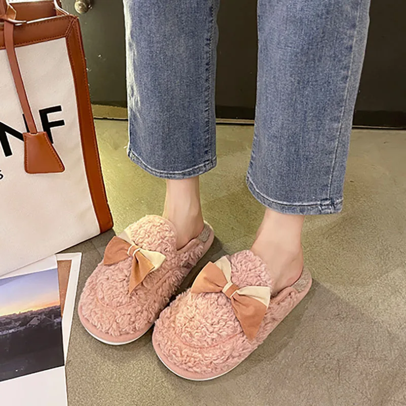 Женские пушистые тапочки, модная зимняя теплая флисовая домашняя обувь с бантом, новые женские и мужские мягкие хлопковые тапочки, сланцы б...