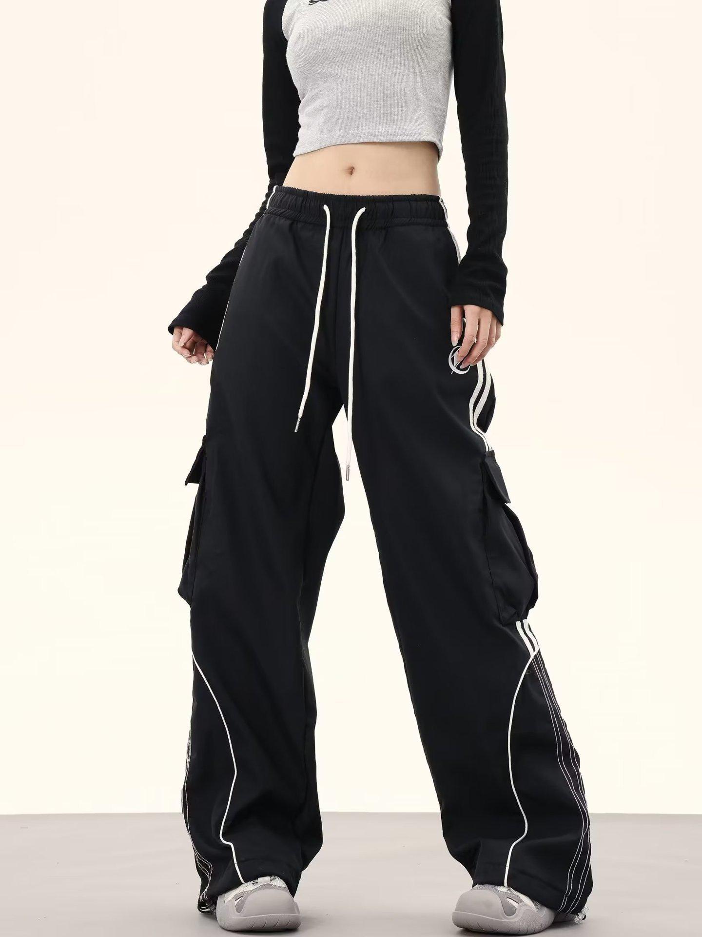 Женские ретро цветные блоки хип-хоп карго спортивные штаны - Свободные широкие штанины до пола Medium чёрный