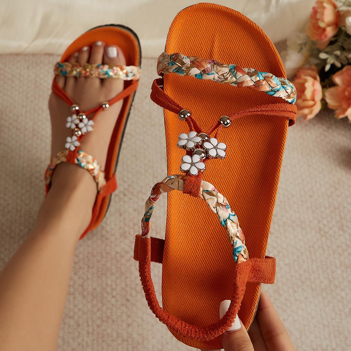 Женские сандалии в богемном стиле, плетеные сандалии на плоской подошве, летние пляжные туфли с принтом, женские римские сандалии на резинке 43 оранжевый