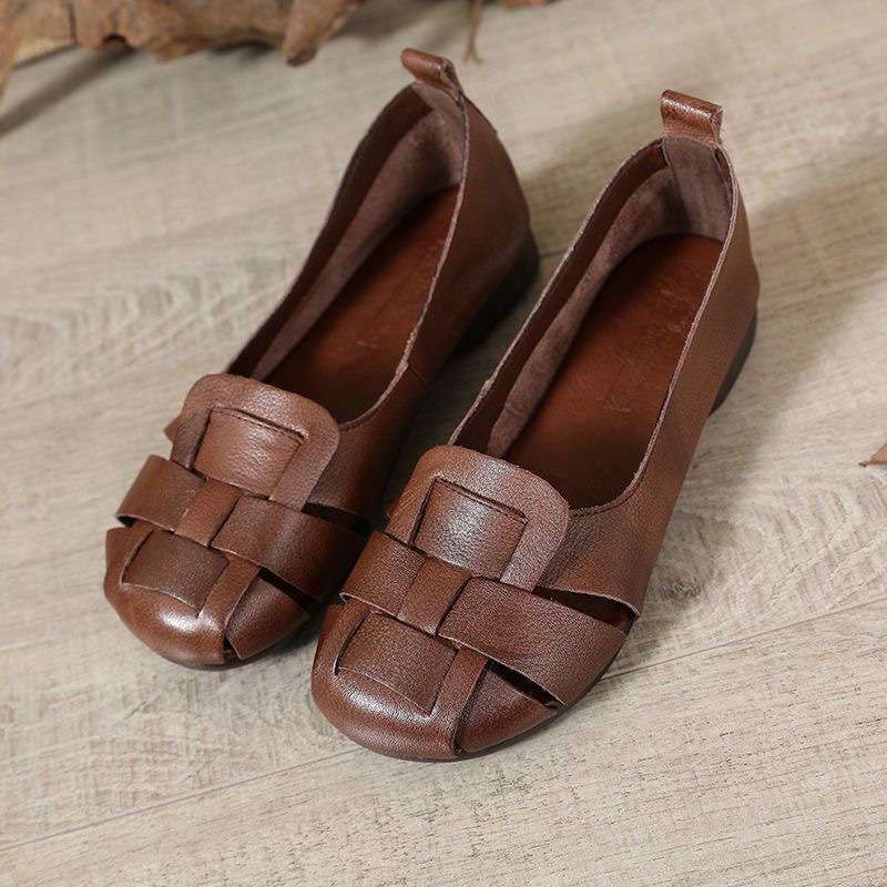 Женские сандалии из натуральной мягкой кожи 2025 лето новые литературные и ретро универсальные на плоской подошве с закрытым носком нескользящие большого размера обувь для мамы 40 коричневый