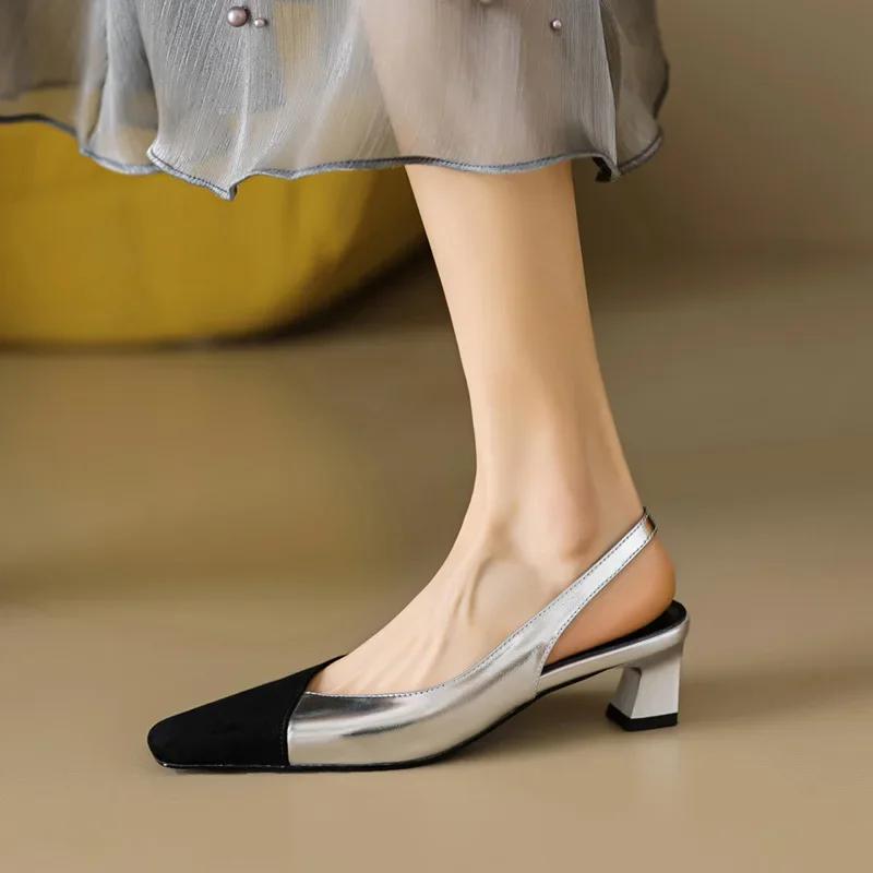 Женские сандалии с квадратным носком, черные туфли-лодочки в стиле пэчворк, золотистые и серебристые с ремешком на пятке, на среднем каблуке, летняя женская обувь для платья, большой размер 41 35 серебряный