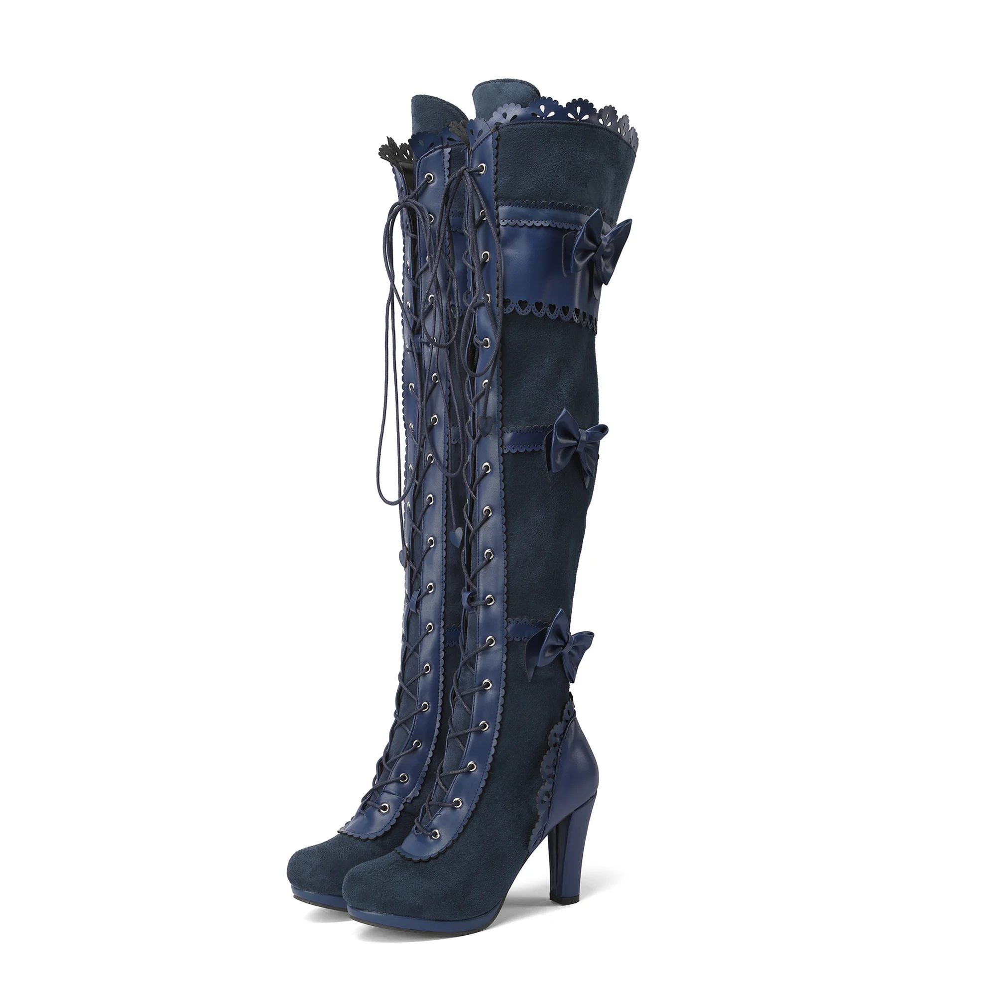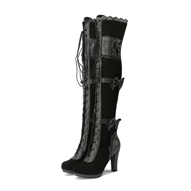 Женские сапоги выше колена, черные шикарные сапоги на шнуровке с бантом в готическом стиле для косплея, осенне-зимняя Боевая обувь, удобные женские сапоги
