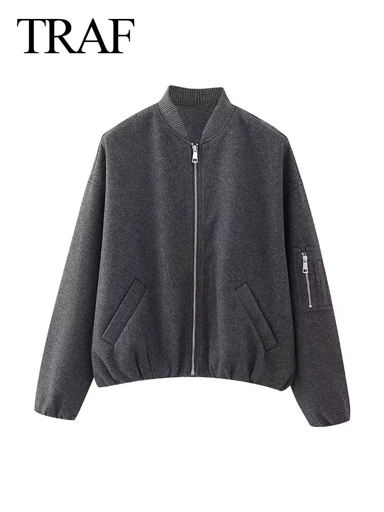 TRAF Autumn Winter Women Fashion Classic Bomber Jacket Stand Collar Long Sleeve Zipper Pocket Street Casual Chic Female Coat