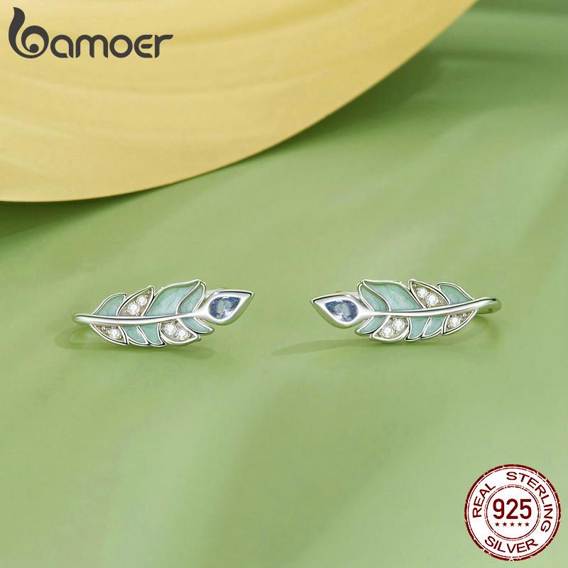 Женские серьги-гвоздики BAMOER из стерлингового серебра 925 пробы с мятно-зеленой эмалью и перьями, подарок на день рождения, изысканные ювелирные изделия 925 silver