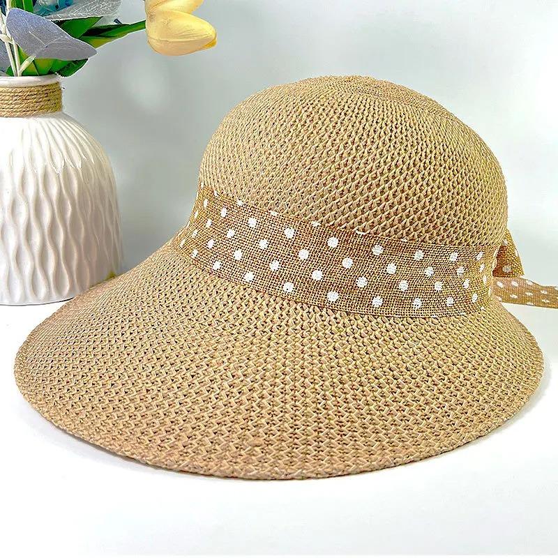 Женские солнцезащитные козырьки с бантом и широкими полями в горошек, льняная лента с бантом, вязаная полая панамская кепка для девочек, летняя защита от ультрафиолета, пляжная шляпа для путешествий, модная универсальная шляпа для путешествий 1pc хаки
