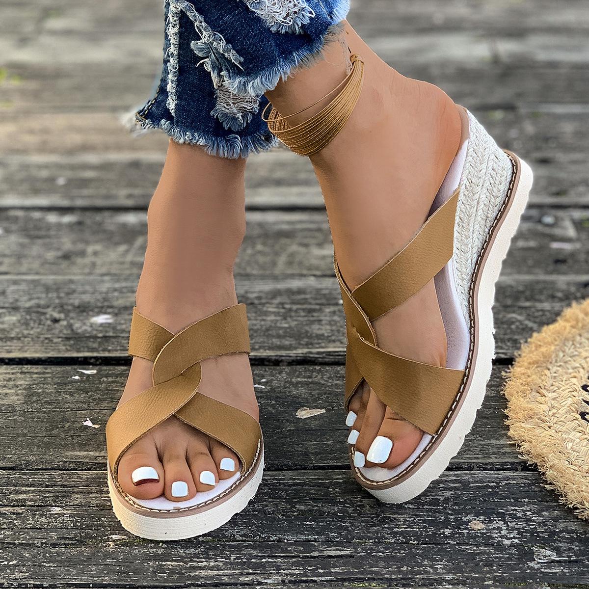 Женские тканые босоножки на высоком каблуке из травы, летние женские пляжные сандалии с пряжкой на подошве «рыбий рот» в римском стиле 36 коричневый